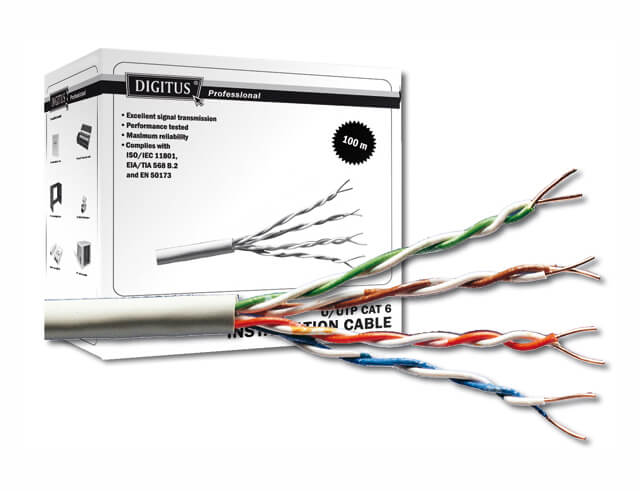4x2xAWG23 U-UTP CAT 6 250 MHz installation cable Suitable for building structured cabling in the secondary and tertiary area. For installation of cable lines of class E, 250 MHz. Conforming to ISO/IEC 11801, DIN EN 50173, DIN EN 50288-5-1 Physical description • Basic Conductor: solid AWG 23/1 • Insulation: PE • Total number of insulated conductors: 8, twisted in 4 pairs • Color code: blue-white, orange-white, green-white, brown-white • Individual pair shield: none • Overall shield: none • Outer jacket: PVC • Color: grey Electrical properties • Mean impedance: 100±5 Ohm @ 1-250 MHz • Vp: 65% nom. • Delay skew: 20 nS/100m max.