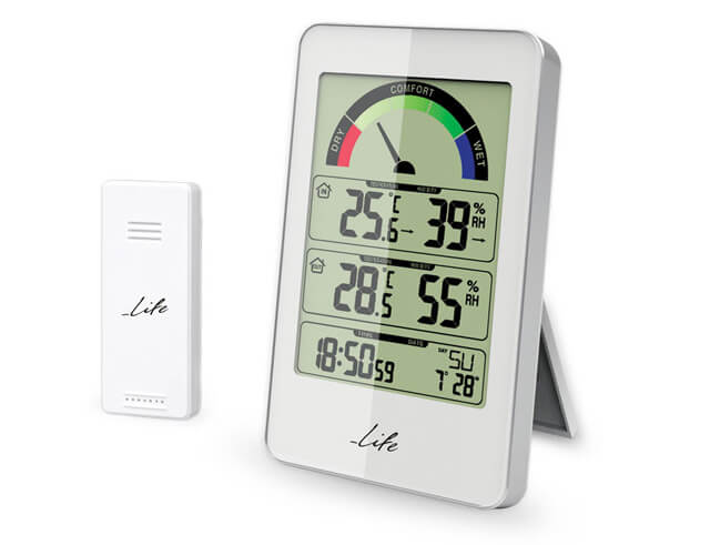 Μετεωρολογικός σταθμός με μεγάλη ψηφιακή οθόνη LCD, ασύρματη εξωτερική μονάδα και λειτουργία ρολογιού / ξυπνητηριού. Προβάλλει θερμοκρασία και υγρασία, τόσο του εσωτερικού όσο και του εξωτερικού χώρου. Διαθέτει επιπλέον ένδειξη ημερήσιας υψηλότερης/χαμηλότερης θερμοκρασίας - υγρασίας ( εσωτερικού και εξωτερικού χώρου), ψηφιακή απεικόνιση του επιπέδου άνεσης υγρασίας αλλά και ένδειξη ώρας και ημερομηνίας. Με minimal σχεδίαση σε λευκό χρώμα με ασημί πλαίσιο, πρακτικό αναδιπλούμενο stand αλλά και δυνατότητα επιτοίχιας ανάρτησης, είναι ιδανικό για κάθε χώρο. Επιπλέον, μπορεί να τοποθετηθεί οπουδήποτε εσείς θέλετε στον χώρο, αφού τόσο η εσωτερική όσο και η εξωτερική μονάδα λειτουργούν με μπαταρίες.