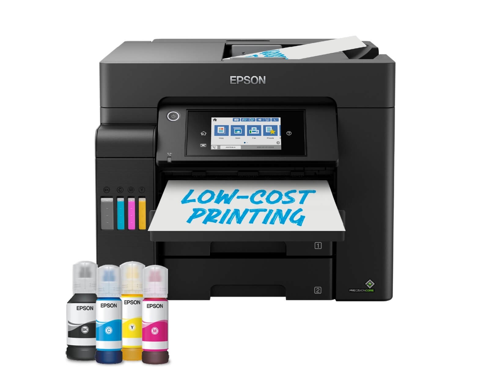 Το μεγάλο μπροστινό δοχείο μελανιού γεμίζει εύκολα με τα φιαλίδια μελανιού που σφραγίζουν ξανά, είναι εύχρηστα και δεν στάζουν. Αυτός ο εκτυπωσής χρησιμοποιεί την κεφαλή εκτύπωσης PrecisionCore χωρίς θερμότητα που είναι γνωστή για την ταχύτητα, την ποιότητα, την αξιοπιστία και την αποδοτικότητά της και διαρκεί όσο και ο εκτυπωτής.