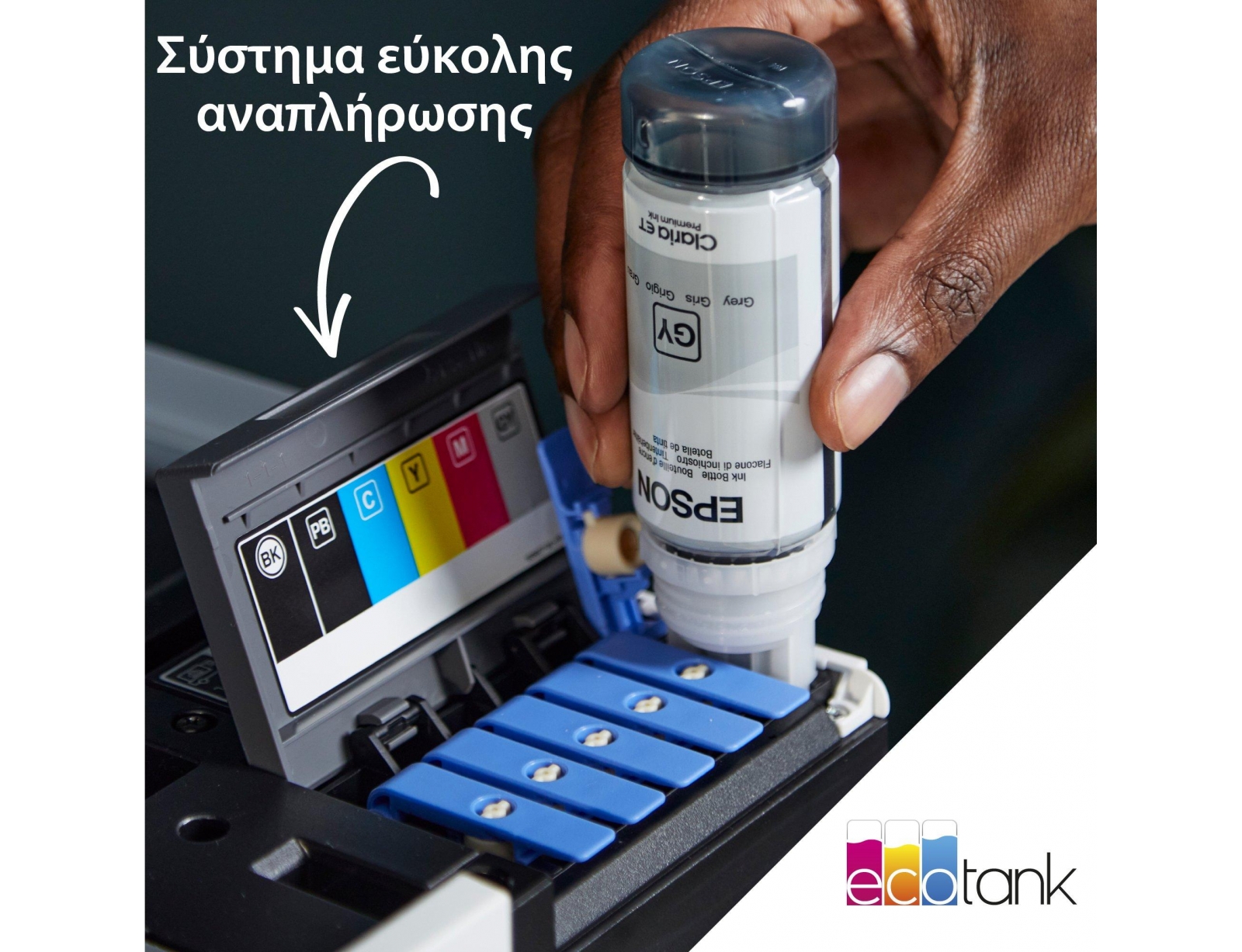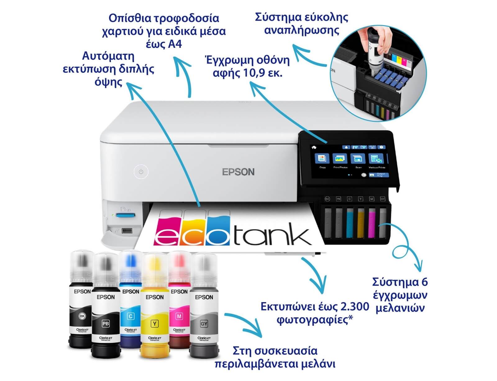 Ξεδιπλώστε τη δημιουργικότητά σας με εκπληκτικές φωτογραφίες και έγγραφα A4 με απίστευτα χαμηλό κόστος ανά σελίδα. Εκτυπώστε, αντιγράψτε και σαρώστε εύκολα χρησιμοποιώντας την εντυπωσιακή έγχρωμη οθόνη αφής 10,9 εκ., τη διαχείριση μέσων με 5 τρόπους και το πρωτοποριακό σύστημα μελανιών 6 χρωμάτων. Χωρίς φύσιγγες για αντικατάσταση και με ευέλικτες δυνατότητες διασύνδεσης, είναι ο ιδανικός εκτυπωτής για κάθε δημιουργική σύγχρονη οικογένεια.