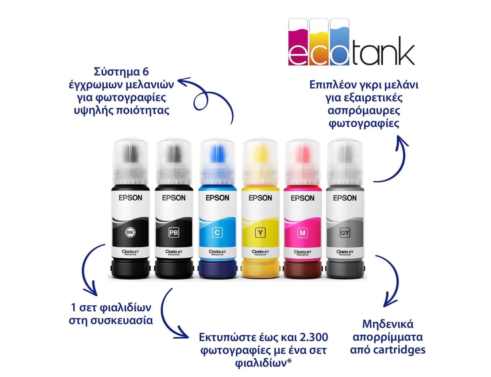 Τα μελάνια Epson Claria ET Premium παράγουν φωτογραφίες υψηλής ποιότητας και μεγάλης διάρκειας ζωής, μεγέθους έως A4, καθώς και εξαιρετικές ασπρόμαυρες φωτογραφίες χάρη στο νέο γκρι μελάνι. Το μαύρο μελάνι pigment είναι ιδανικό για την εκτύπωση ευκρινούς κειμένου σε απλά χαρτιά.