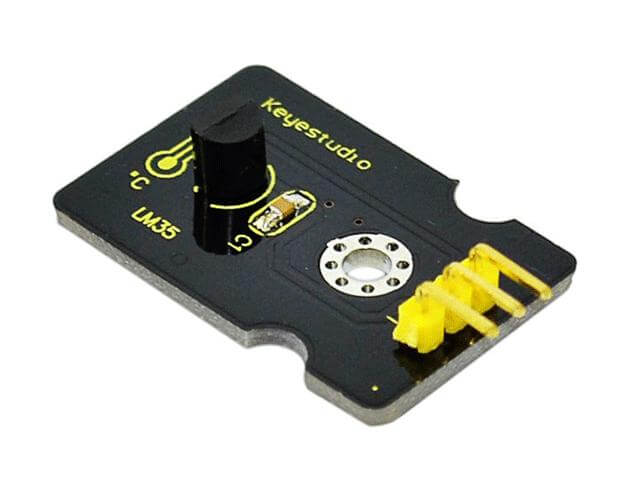 LM35 linear temperature sensor της Keyestudio για Arduino. Μπορεί να χρησιμοποιηθεί για την ανίχνευση της θερμοκρασίας του αέρα του περιβάλλοντος. Προσφέρει λειτουργικό εύρος από 0°C έως 100°C. Η ευαισθησία είναι 10mV ανά βαθμό Κελσίου και η τάση εξόδου είναι ανάλογη της θερμοκρασίας.