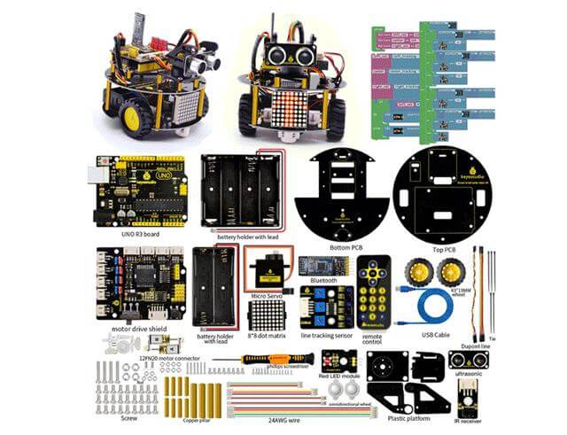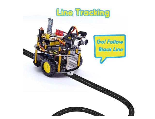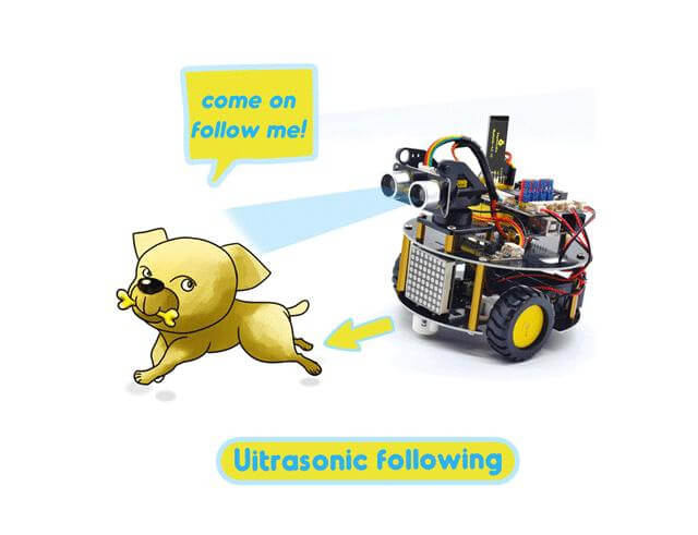 - Multi-purpose function: Obstacle avoidance, follow, IR remote control, Bluetooth control, ultrasonic follow and displayed face emoticons