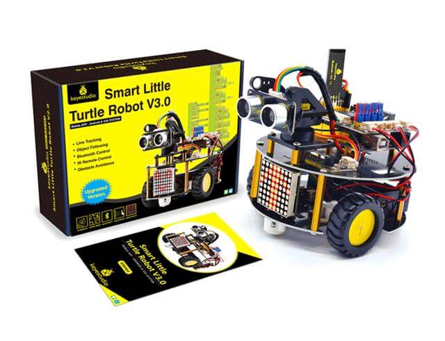 Το kit smart little turtle robot V3.0 σας δίνει την δυνατότητα να κατασκευάσετε το δικό σας smart ρομπότ μέσω της ολοκλήρωσης πολλών δημιουργικών projects και να μάθετε να το ελέγχετε με mixly blocks coding. Διαθέτει λειτουργίες όπως line tracking, αποφυγή εμποδίων, cross maze, ultrasonic following, έλεγχο από ασύρματο χειριστήριο IR και smartphone μέσω Bluetooth.