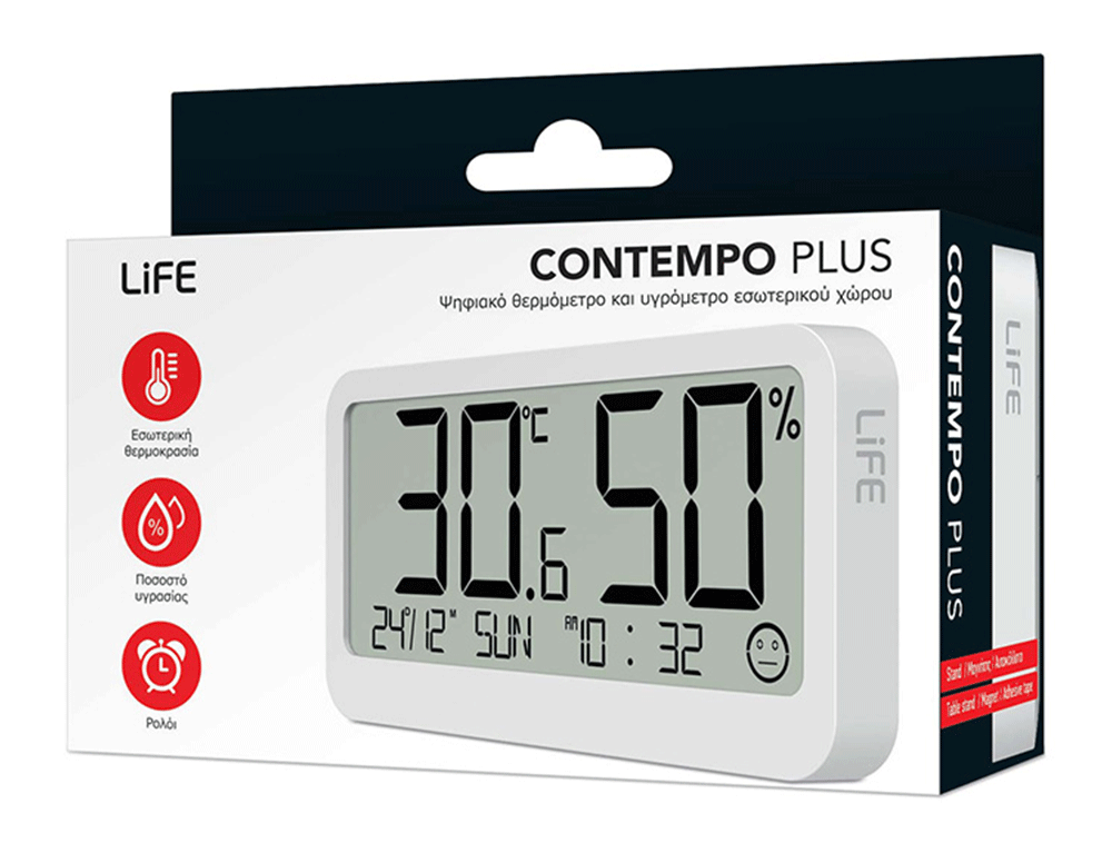 - θερμοκρασία και υγρασία με μεγάλα ψηφία και ώρα-ημερομηνία με μικρά ψηφία