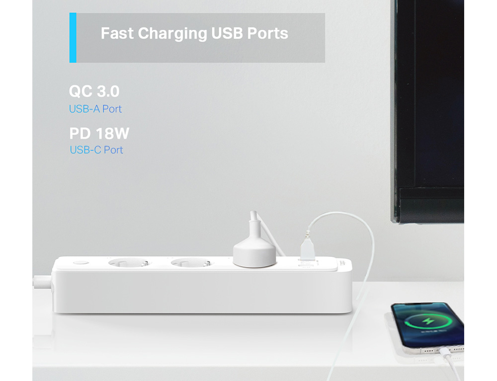 Smart Πολύπριζο TP-Link Tapo P300 με φωνητικό έλεγχο - 3x Smart Sockets, 1x USB C, 2x USB A (QC 3.0) - WiFi 2.4GHz, Bluetooth 4.2 - Καλώδιο 1.5m - Λευκό