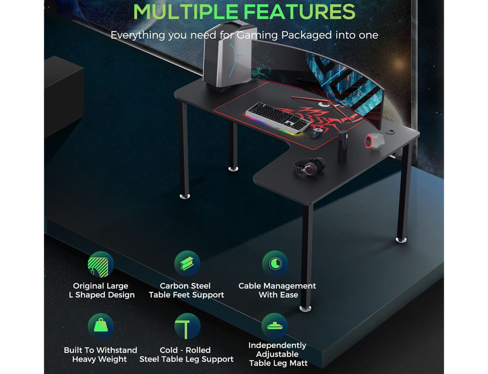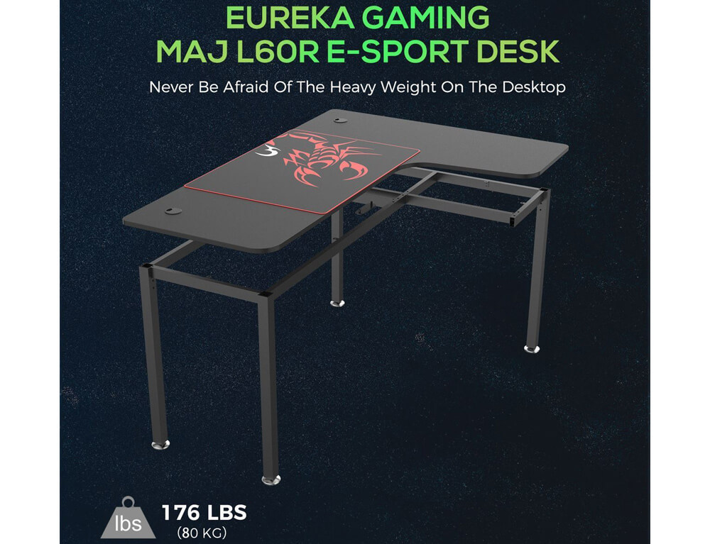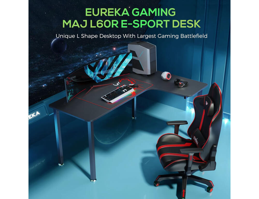 Το γωνιακό γραφείο gaming της εταιρείας Eureka Ergonomic διαθέτει μεταλλικά πόδια. Η επένδυση της επιφάνειας του γραφείου είναι με carbon fiber (ανθρακόνημα) το οποίο αποτελείται από λεπτά, ισχυρά κρυσταλλικά νημάτια άνθρακα που προσφέρουν υψηλή αντοχή στα γρατζουνίσματα και την υψηλή θερμότητα. Διαθέτει εργονομικό σχεδιασμό με στόχο να προσφέρει στον χρήστη μια ξεχωριστή εμπειρία gaming σε σχήμα L με υπερμεγέθες mouse-pad και βάση διαχείρησης καλωδίων / πολύπριζων.