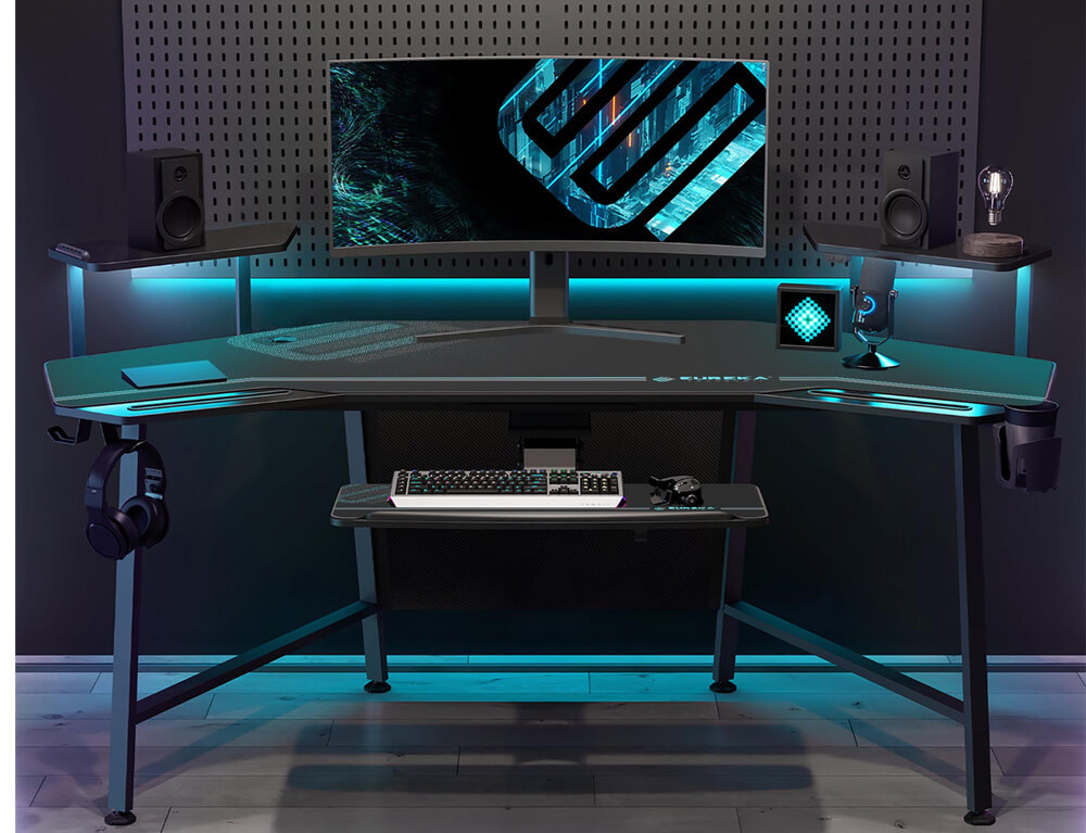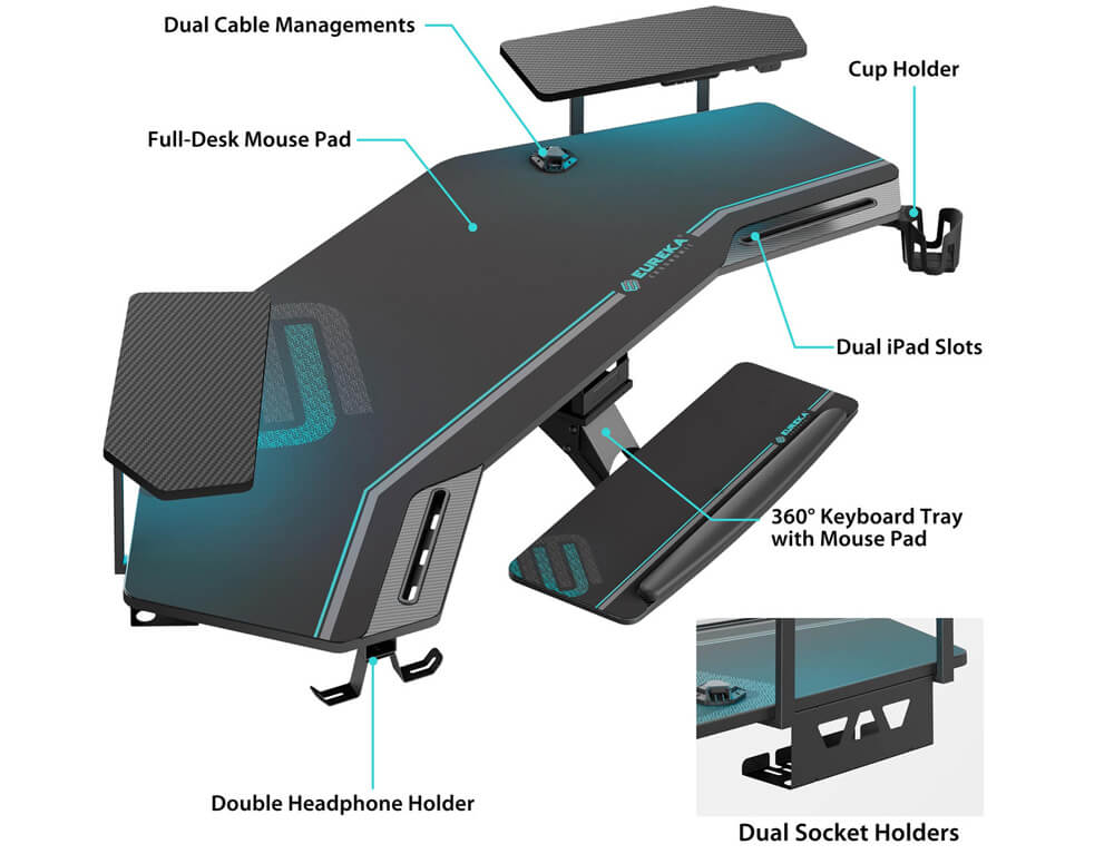 Το γραφείο gaming της εταιρείας Eureka Ergonomic διαθέτει μεταλλικά πόδια. Διαθέτει εργονομικό σχεδιασμό με στόχο να προσφέρει στον χρήστη μια ξεχωριστή εμπειρία gaming.