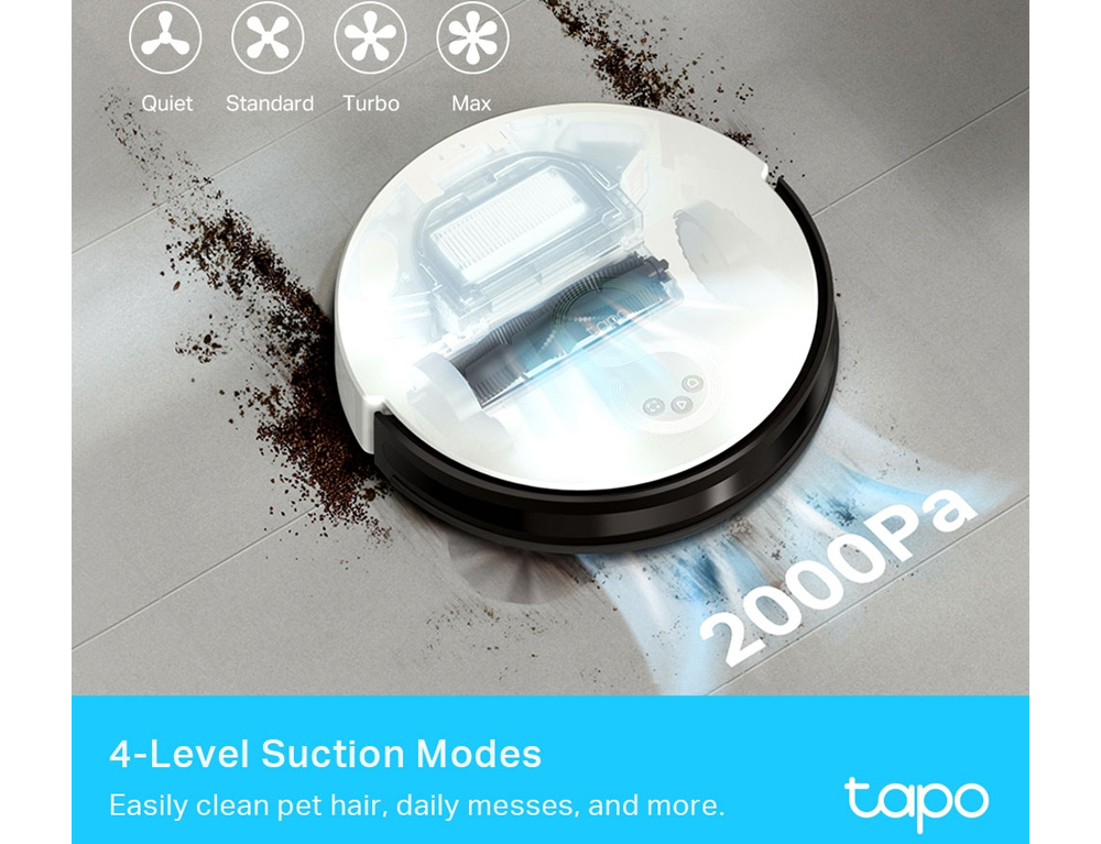 Τέσσερις λειτουργίες κενού με διαφορετικά επίπεδα ισχύος αναρρόφησης καλύπτουν διάφορες ανάγκες καθαρισμού. Με μέγιστη ισχύ αναρρόφησης 2000Pa, το Tapo RV10 είναι ιδανικό για άμεσο, ισχυρό καθαρισμό χαλιών και σκληρών δαπέδων.