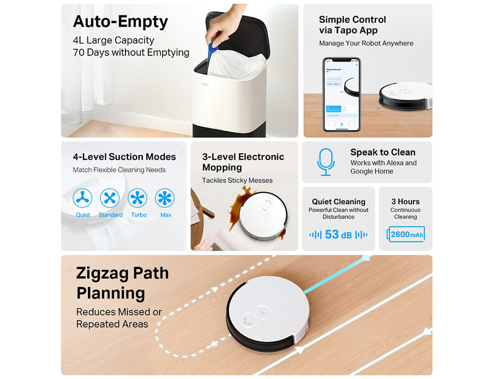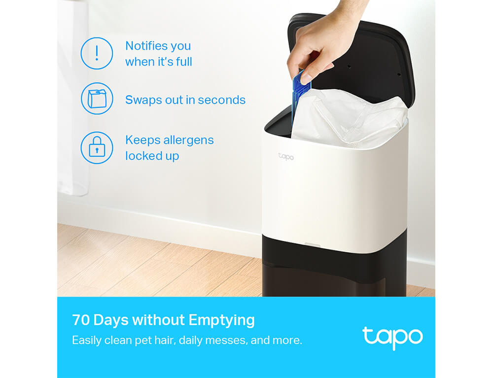 Με την ηλεκτρική σκούπα TP-LINK Tapo RV10 Plus καθαρίστε εύκολα τις τρίχες των κατοικίδιων, τις καθημερινές ακαταστάσεις και πολλά άλλα. Αδειάζει αυτόματα τον κάδο απορριμμάτων μετά τον καθαρισμό για να κρατήσει τα χέρια σας ελεύθερα για έως και 70 ημέρες.