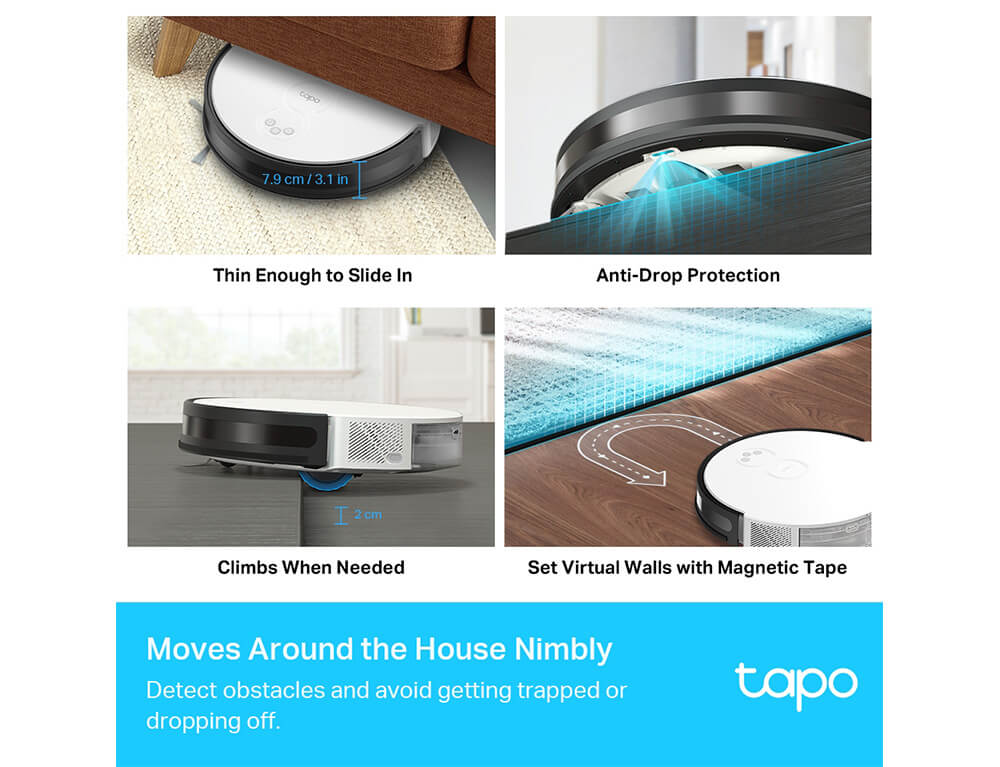 Η τριπλή καταστολή θορύβου μειώνει τα επίπεδα θορύβου στα 53 dB κατά τη χρήση—πιο αθόρυβα από έναν φούρνο μικροκυμάτων που λειτουργεί. Το Tapo καθαρίζει το σπίτι σας χωρίς να ενοχλεί εσάς ή τα κατοικίδιά σας.