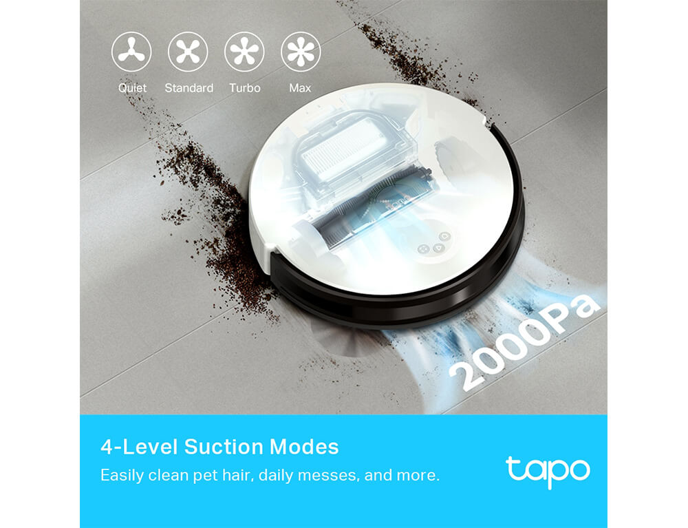 Τέσσερις λειτουργίες καθαρισμού με διαφορετικά επίπεδα ισχύος απορρόφησης καλύπτουν διάφορες ανάγκες καθαρισμού. Με μέγιστη ισχύ αναρρόφησης 2000Pa, το Tapo RV10 Plus είναι ιδανικό για άμεσο, ισχυρό καθαρισμό χαλιών και σκληρών δαπέδων.