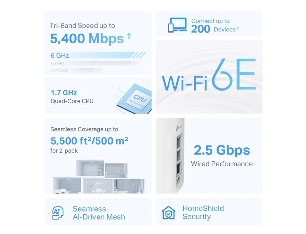 Ολοκαίνουργιο 6 GHz Band – Απολαύστε την πιο πρόσφατη συχνότητα WiFi. Η ζώνη των 6 GHz παρέχει επίσης ισχυρό αποκλειστικό backhaul για περαιτέρω εξορθολογισμό της απόδοσης WiFi συσκευών εκτός 6E.