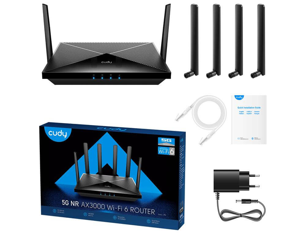 Cudy P5. Ασύρματο 5G Router Wi‑Fi 6 με 4 Θύρες Gigabit Ethernet. Συνδέεται στο δίκτυο 5G, είναι γενιάς Wi‑Fi 6 και εκπέμπει σήμα σε δύο συχνότητες, 2.4 & 5GHz.