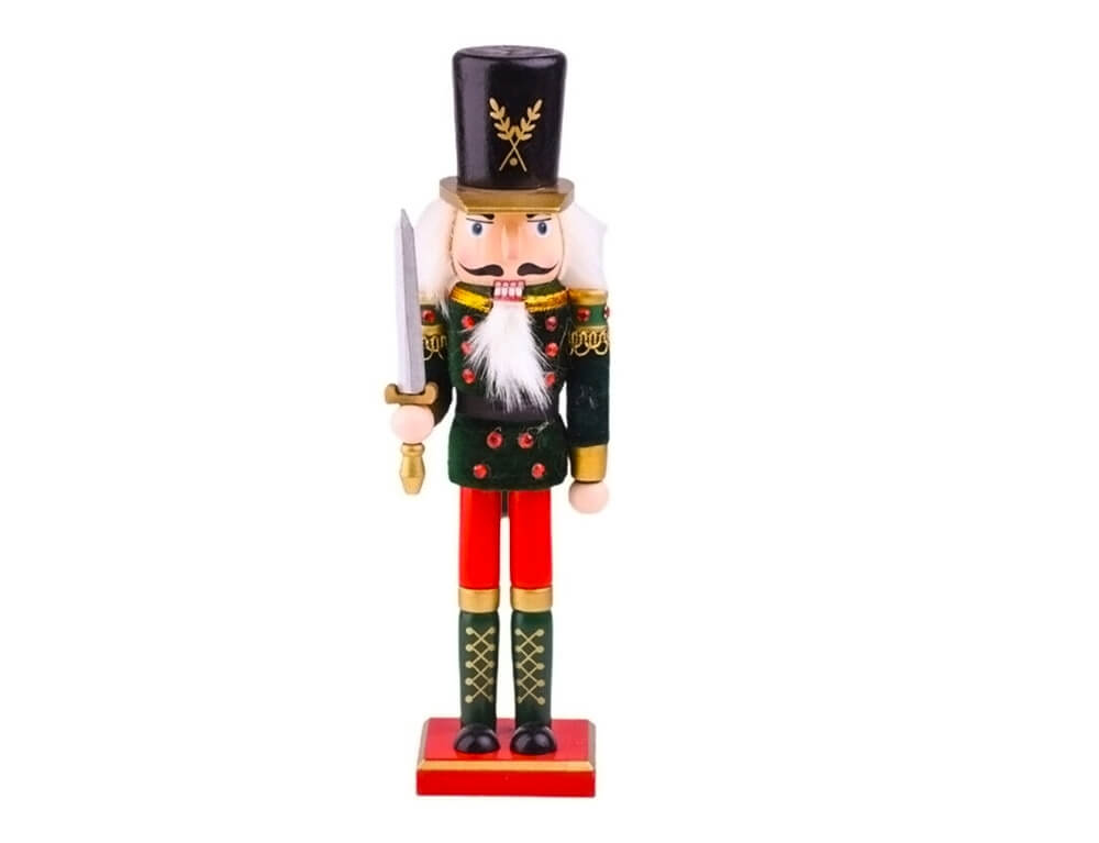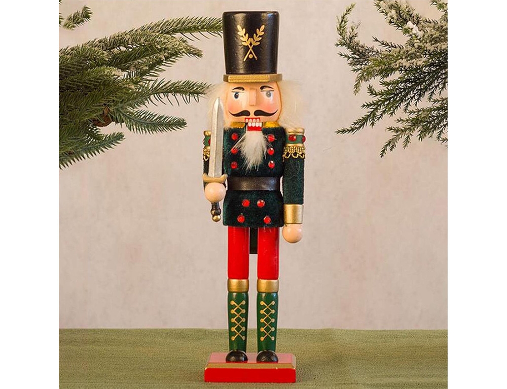 Χριστουγεννιάτικο διακοσμητικό, από την σειρά ξύλινοι στρατιώτες, ο στρατιώτης με πράσινη/κόκκινη στολή, χρυσές λεπτομέρειες, κόκκινα πετράδια και σπαθί.