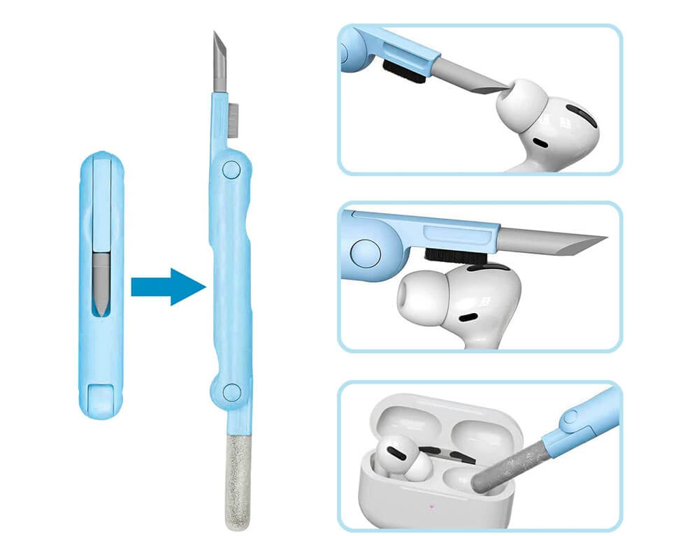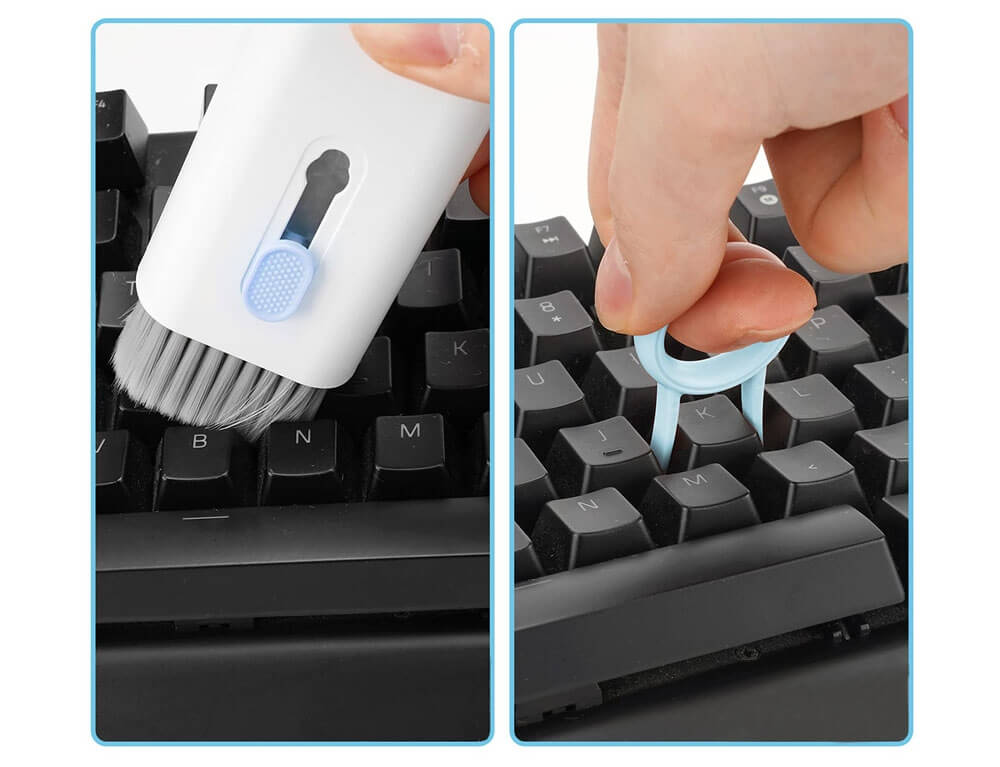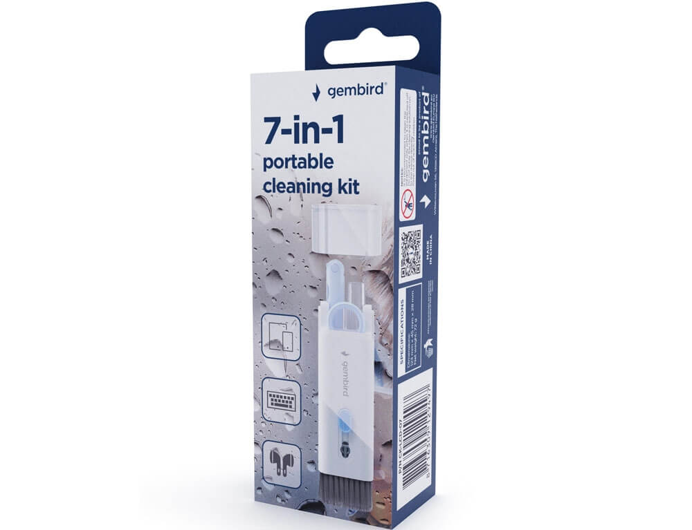 Το συμπαγές φορητό κιτ καθαρισμού 7 σε 1 είναι μια ευέλικτη λύση για να διατηρείτε τις συσκευές τεχνολογίας πεντακάθαρες και λαμπερές. Περιλαμβάνει μπουκάλι σπρέι καθαρισμού, υαλοκαθαριστήρα μικροϊνών, εξολκέα πλήκτρων πληκτρολογίου, αναδιπλούμενη βούρτσα και ειδικό εργαλείο καθαρισμού ακουστικών. Το κιτ έχει σχεδιαστεί για την απομάκρυνση ρύπων, σκόνης και βρωμιάς από διάφορες συσκευές, όπως ασύρματα in-ears, ακουστικά, smartphones, φορητούς υπολογιστές, πληκτρολόγια και εσωτερικούς χώρους αυτοκινήτων. Το σετ είναι συμπαγές και ελαφρύ, ώστε να μπορείτε να το μεταφέρετε εύκολα στην τσάντα ή την τσέπη σας.