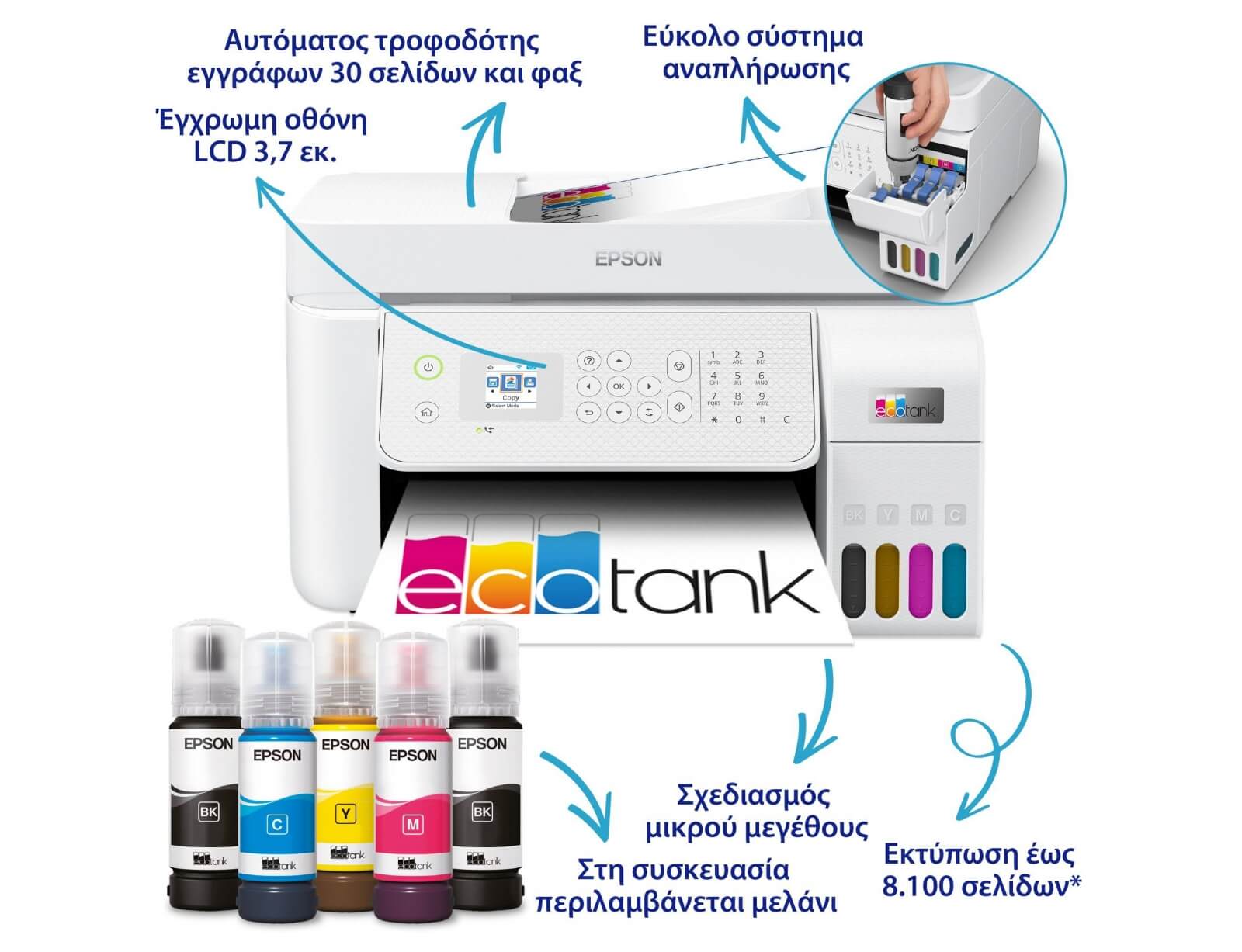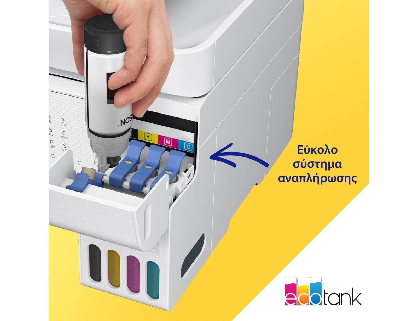 Ο εκτυπωτής EcoTank παρέχει εύκολη εκτύπωση για οικιακή χρήση και μικρά γραφεία. Τα δοχεία μελανιού εξαιρετικά υψηλής χωρητικότητας επιτρέπουν την αναπλήρωση χωρίς ταλαιπωρία και τα φιαλίδια με λειτουργία κλειδώματος έχουν σχεδιαστεί έτσι ώστε να είναι δυνατή η τοποθέτηση μόνο του σωστού χρώματος.