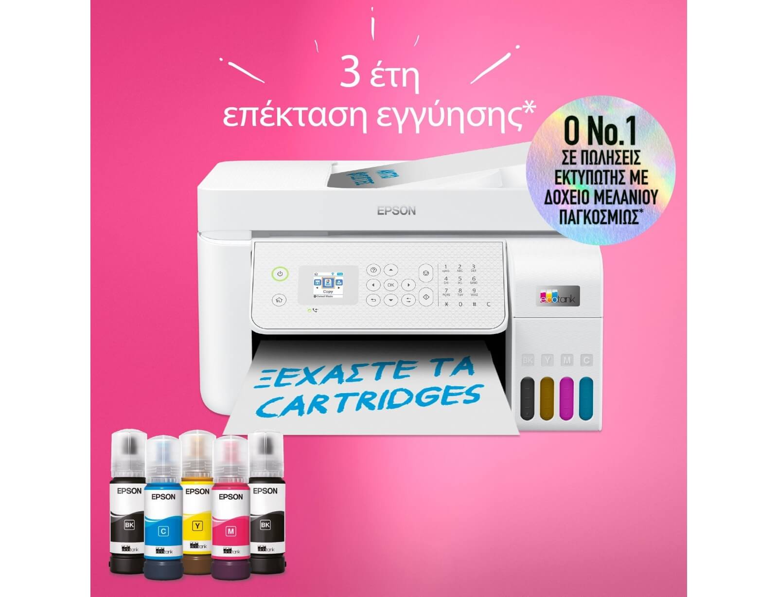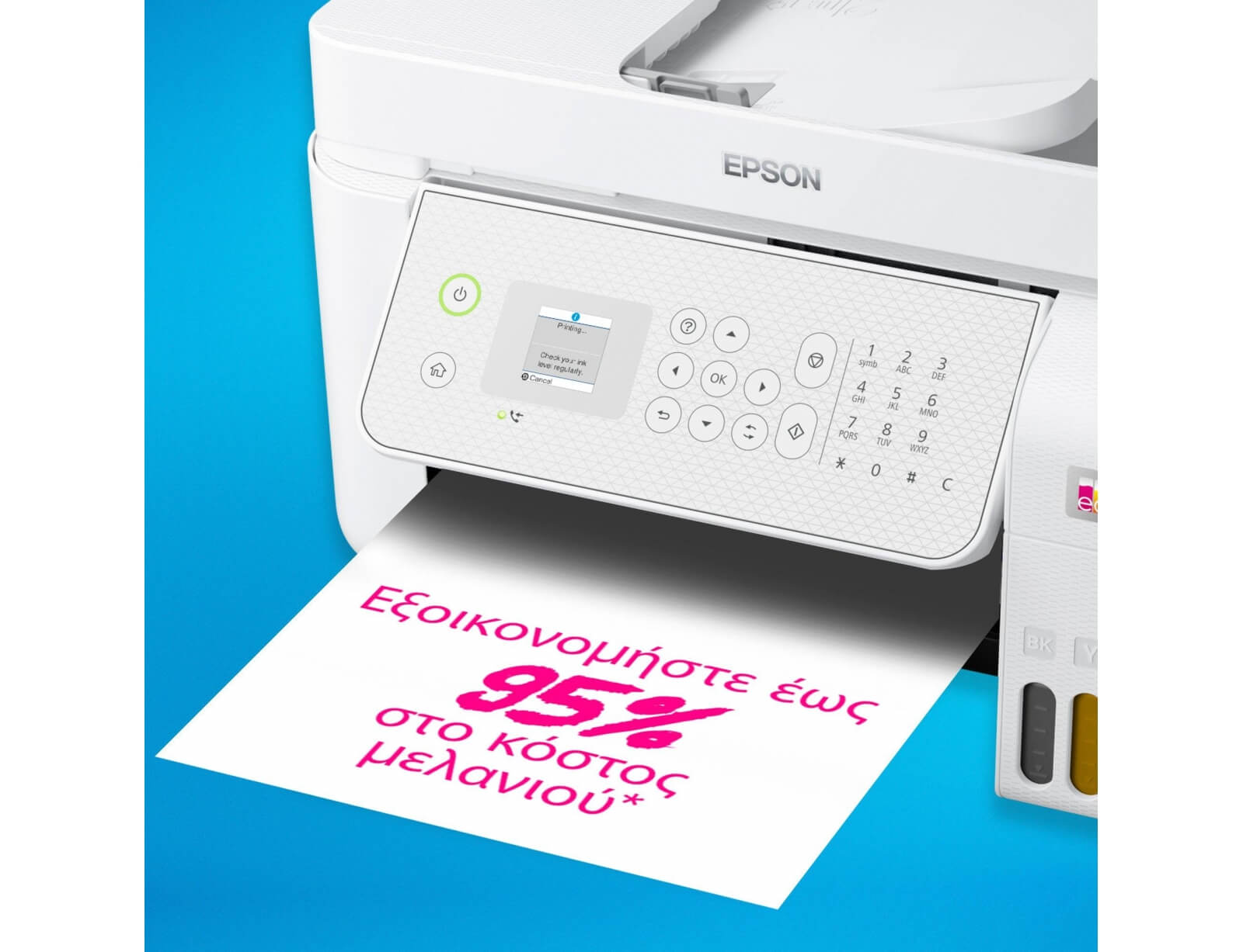 Αυτός ο οικονομικός εκτυπωτής μειώνει το κόστος εκτύπωσης έως 95%* και περιλαμβάνει στη συσκευασία μελάνι που καλύπτει τις ανάγκες σας για έως 3 έτη*. Εκτυπώστε έως 8.100 ασπρόμαυρες και 6.500 έγχρωμες σελίδες.