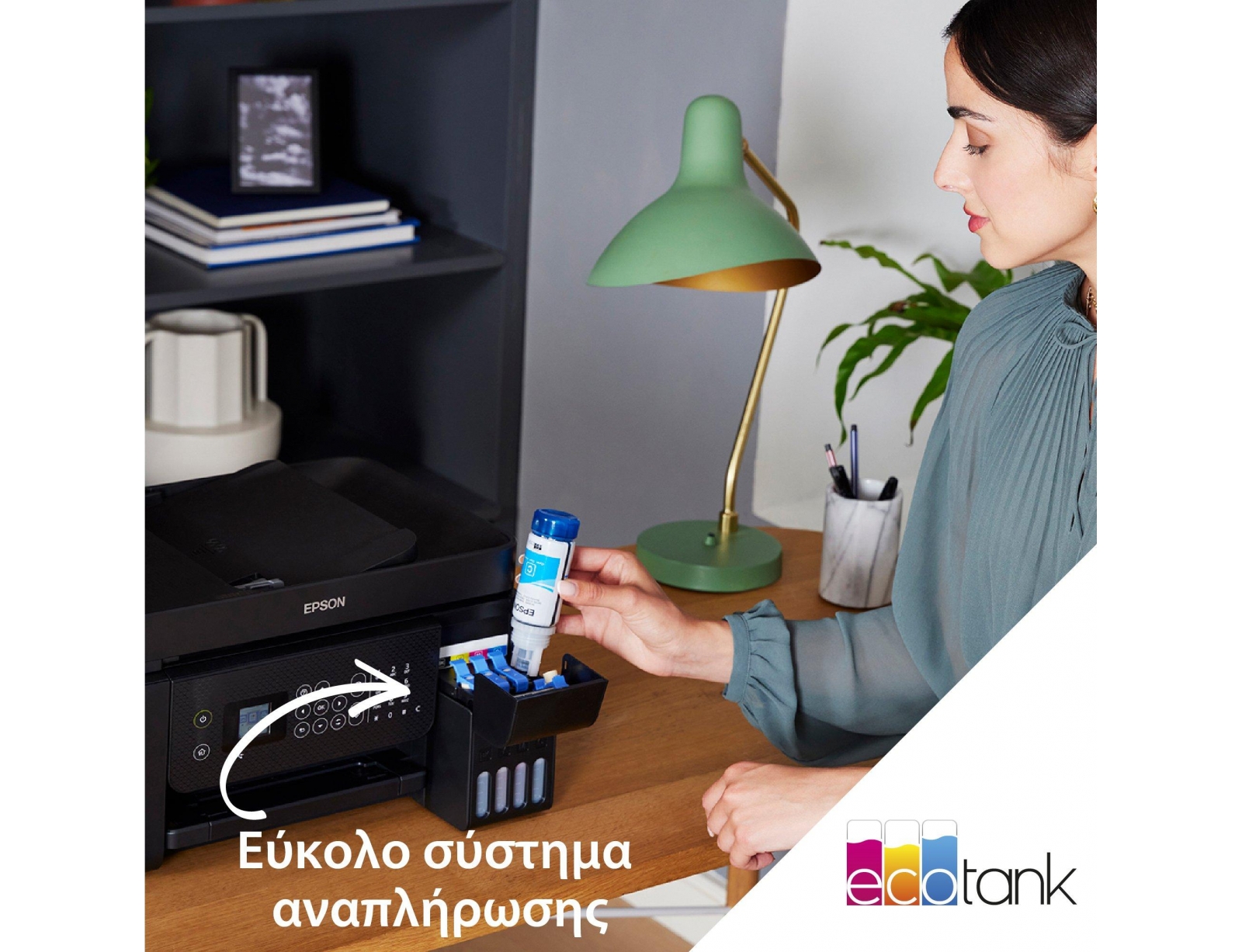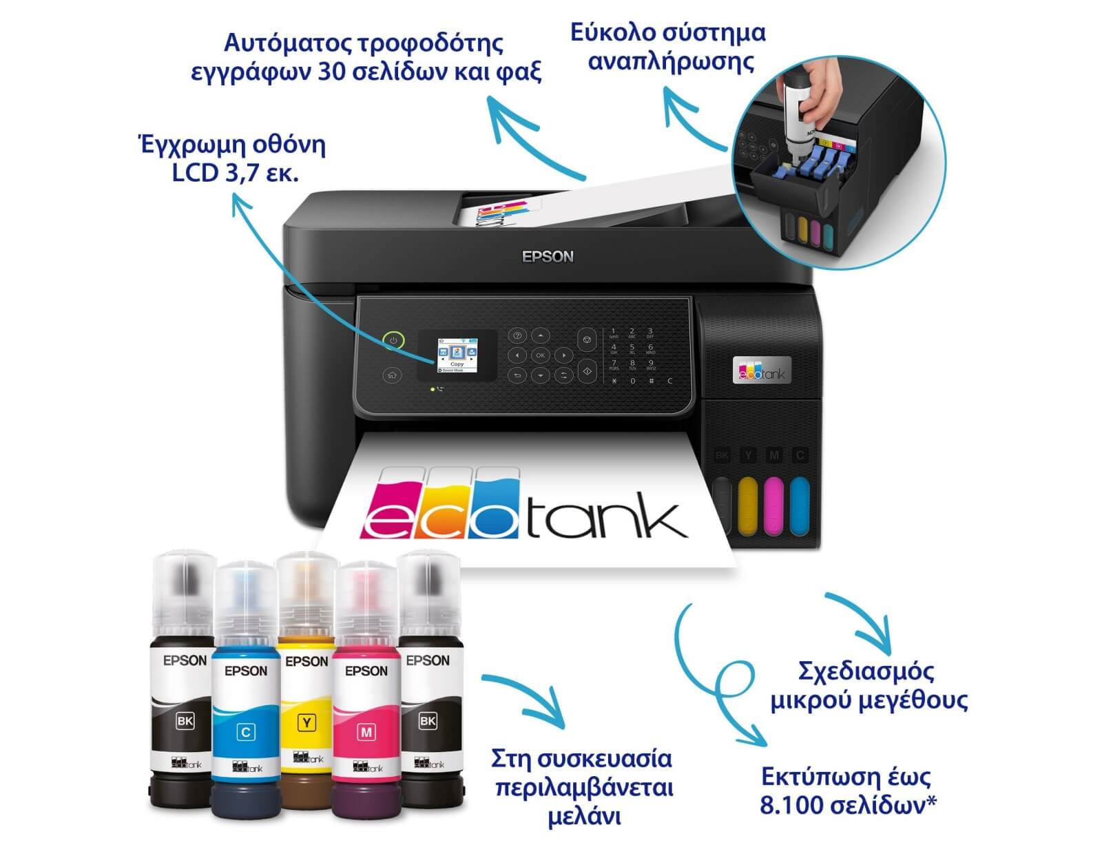 Ο εκτυπωτής EcoTank παρέχει εύκολη εκτύπωση για οικιακή χρήση και μικρά γραφεία. Τα δοχεία μελανιού εξαιρετικά υψηλής χωρητικότητας επιτρέπουν την αναπλήρωση χωρίς ταλαιπωρία και τα φιαλίδια με λειτουργία κλειδώματος έχουν σχεδιαστεί έτσι ώστε να είναι δυνατή η τοποθέτηση μόνο του σωστού χρώματος.