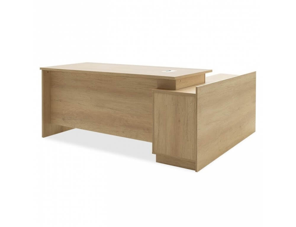 - Βοηθητικό γραφείο: Το γραφείο στην αριστερή του πλευρά στηρίζεται σε ερμάριο που διαθέτει πολλαπλούς αποθηκευτικούς χώρους: Συρτάρι, ντουλάπι και ράφι. Επιφάνεια κατασκευασμένη από μοριοσανίδα υψηλής ποιότητας με επένδυση μελαμίνης, πάχους 25 χιλ. Τα πλαϊνά μέρη είναι 16 χιλ, όλα στον χρωματισμό του sonoma.