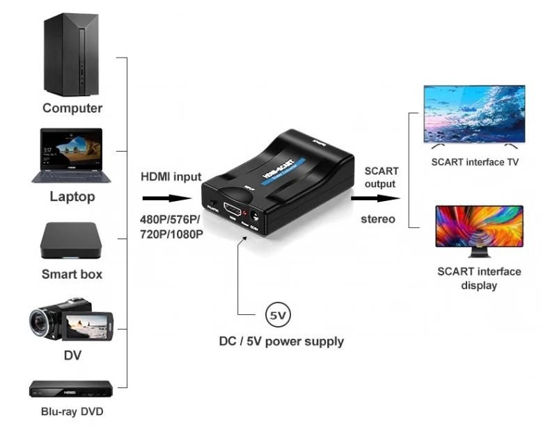Επιτρέπει τη μετατροπή σήματος από παλαιότερες συσκευές με έξοδο SCART σε νεότερες οθόνες ή τηλεοράσεις με είσοδο HDMI.Πρόκειται για ένα χρήσιμο εργαλείο για να συνεχίσετε να χρησιμοποιείτε συσκευές όπως παλιές κονσόλες, βίντεο ή DVD players με σύγχρονες τηλεοράσεις.