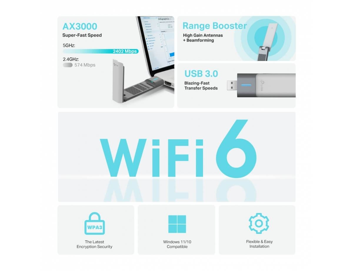 - Γρήγορο Wi-Fi 6: 5 GHz έως 2402 Mbps, 2,4 GHz έως 574 Mbps