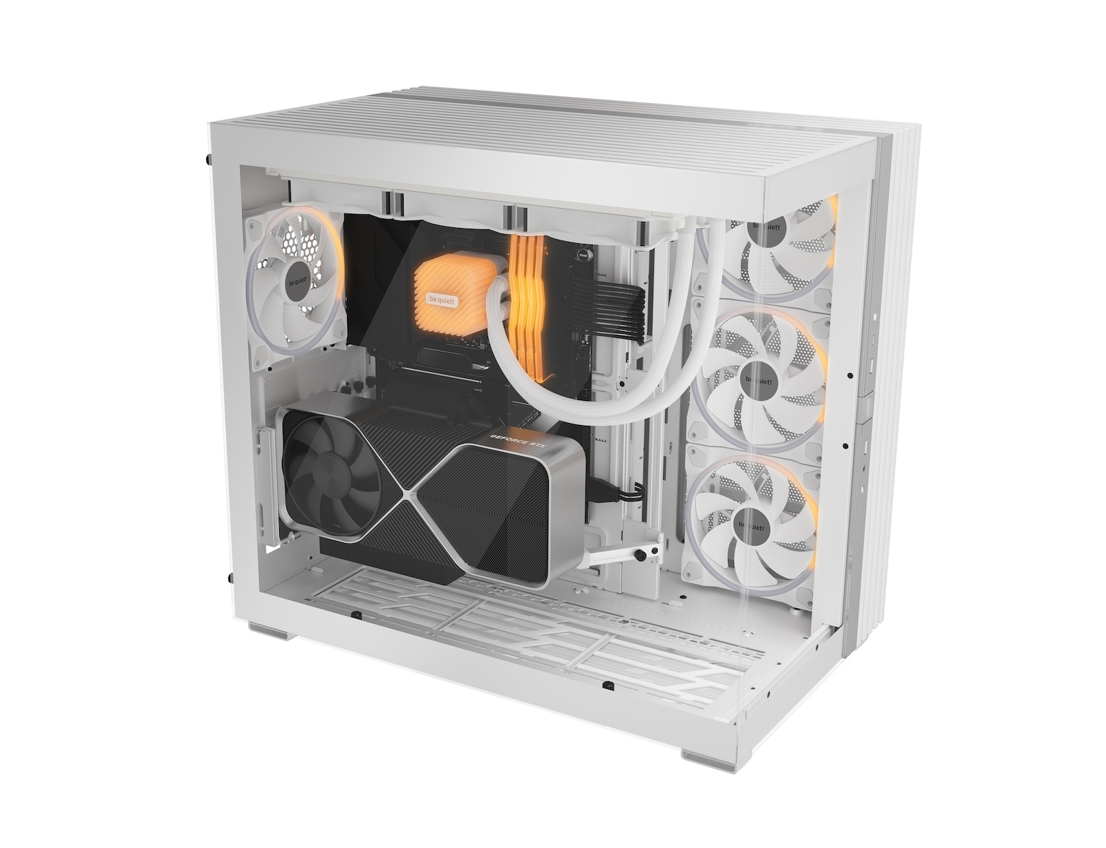 Η Light Base 900 DX White δεν διαθέτει προεγκατεστημένους ανεμιστήρες. Ωστόσο, μπορούν να εγκατασταθούν έως και 10 ανεμιστήρες συνολικά, καθιστώντας την Light Base 900 DX White εξαιρετικά ευέλικτη. Με τον εξαιρετικά ευρύχωρο σχεδιασμό της, μπορεί να χωρέσει έως και 420 mm radiators ταυτόχρονα, μια μητρική πλακέτα E-ATX, ακόμη και τις πιο ισχυρές κάρτες γραφικών. Χάρη στον σχεδιασμό δύο θαλάμων, οι μονάδες δίσκου και τα καλώδια είναι τοποθετημένα προσεκτικά στο πίσω μέρος και δεν εμποδίζουν τη ροή του αέρα.