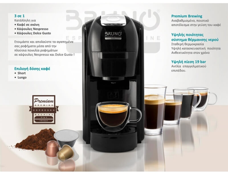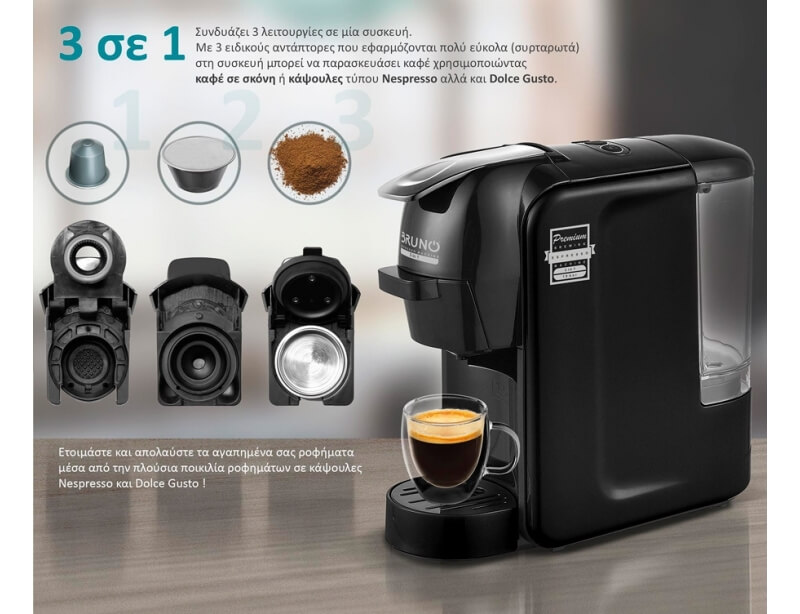 - Τύπος καφέ: αλεσμένος καφές & 2 ειδών κάψουλες (Nespresso, Dolce Gusto)