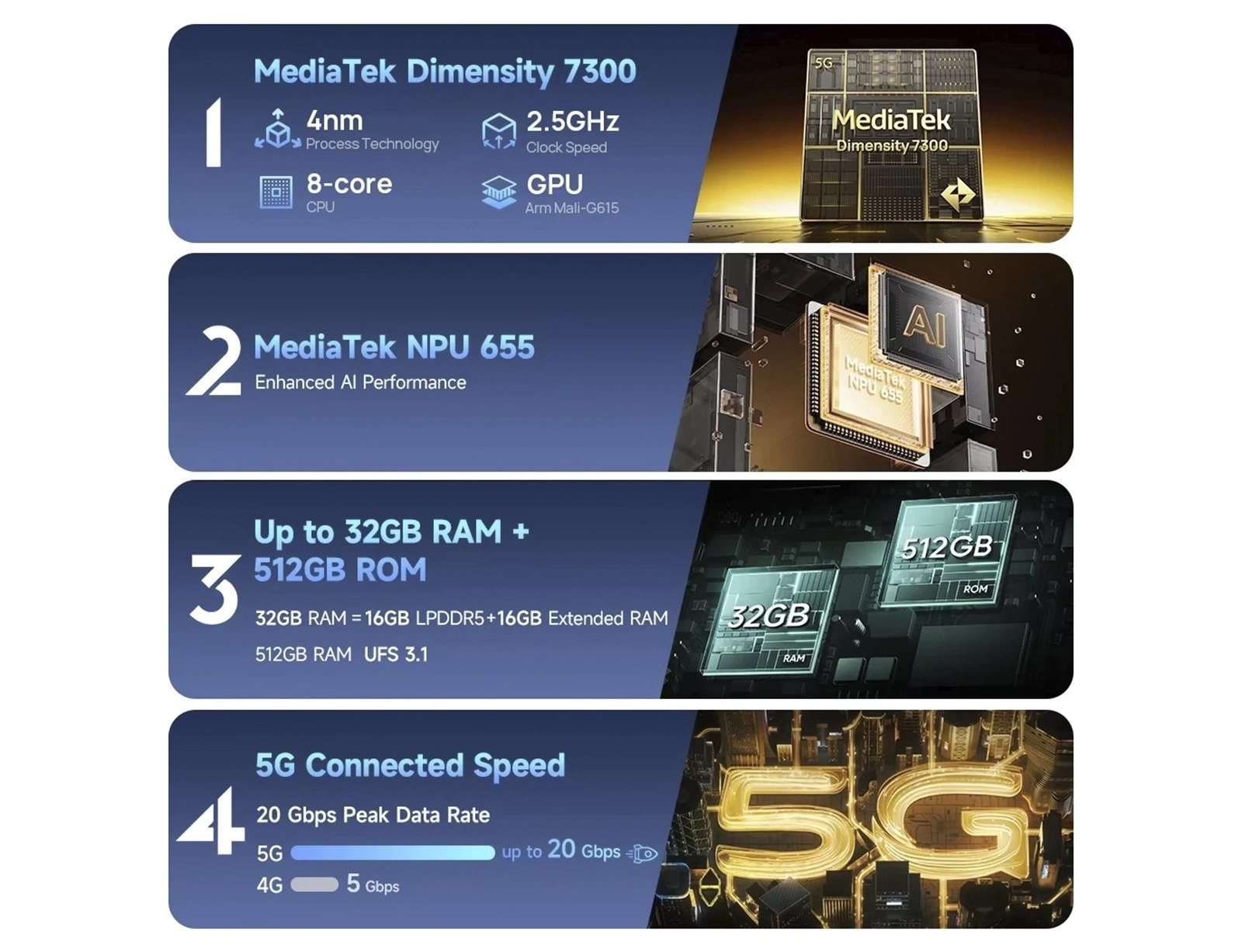 - Επεξεργαστής: MediaTek Dimensity 7300, Octa Core, up to 2.5GHz