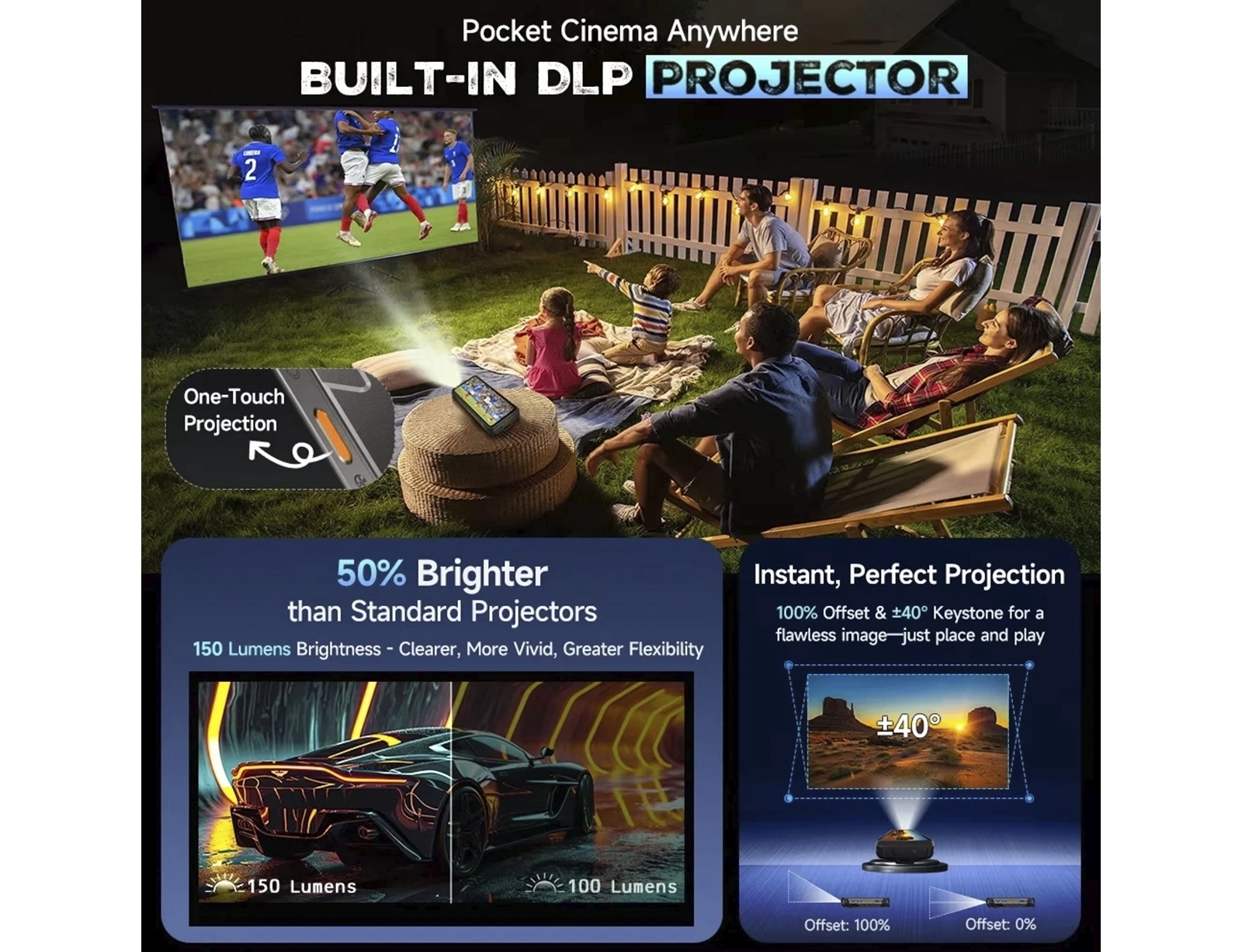- Projector: 150 lumens max, Autofocus, Keystone Correction: +/-40° Manual Vertical, Throw Ratio: 1.3 : 1, DMD: 0.2", Resolution: 854 x 480, Offset: 100%, Image: Size 30" -100", Throw Distance: 34.02" - 113.75"