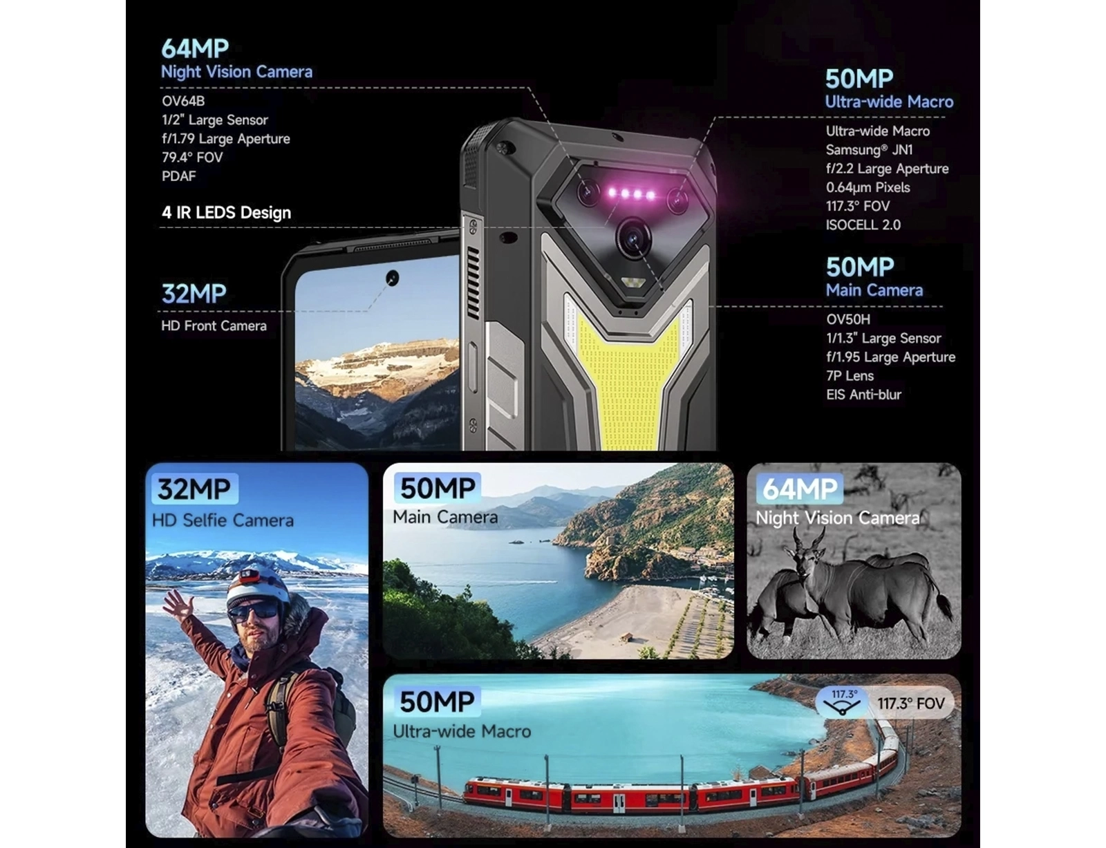 - 50MP κύρια κάμερα, 64MP κάμερα νυχτερινής όρασης & 50MP ευρυγώνια κάμερα