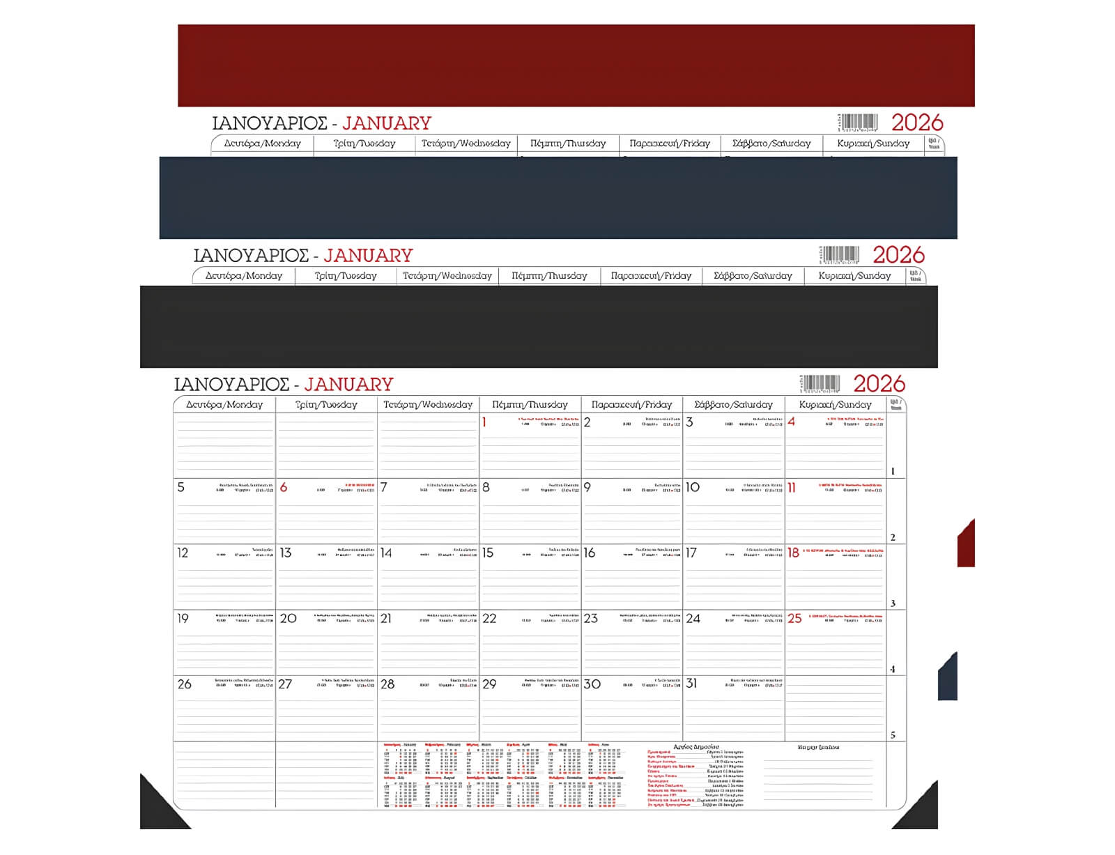 Μηνιαίο επιτραπέζιο ημερολόγιο με δίχρωμη εκτύπωση σε χαρτί 70γρ. Διαθέτει εορτολόγιο, επίσημες αργίες, σύνοψη μηνών, Ανατολή - Δύση Ηλίου και φάσεις σελήνης.