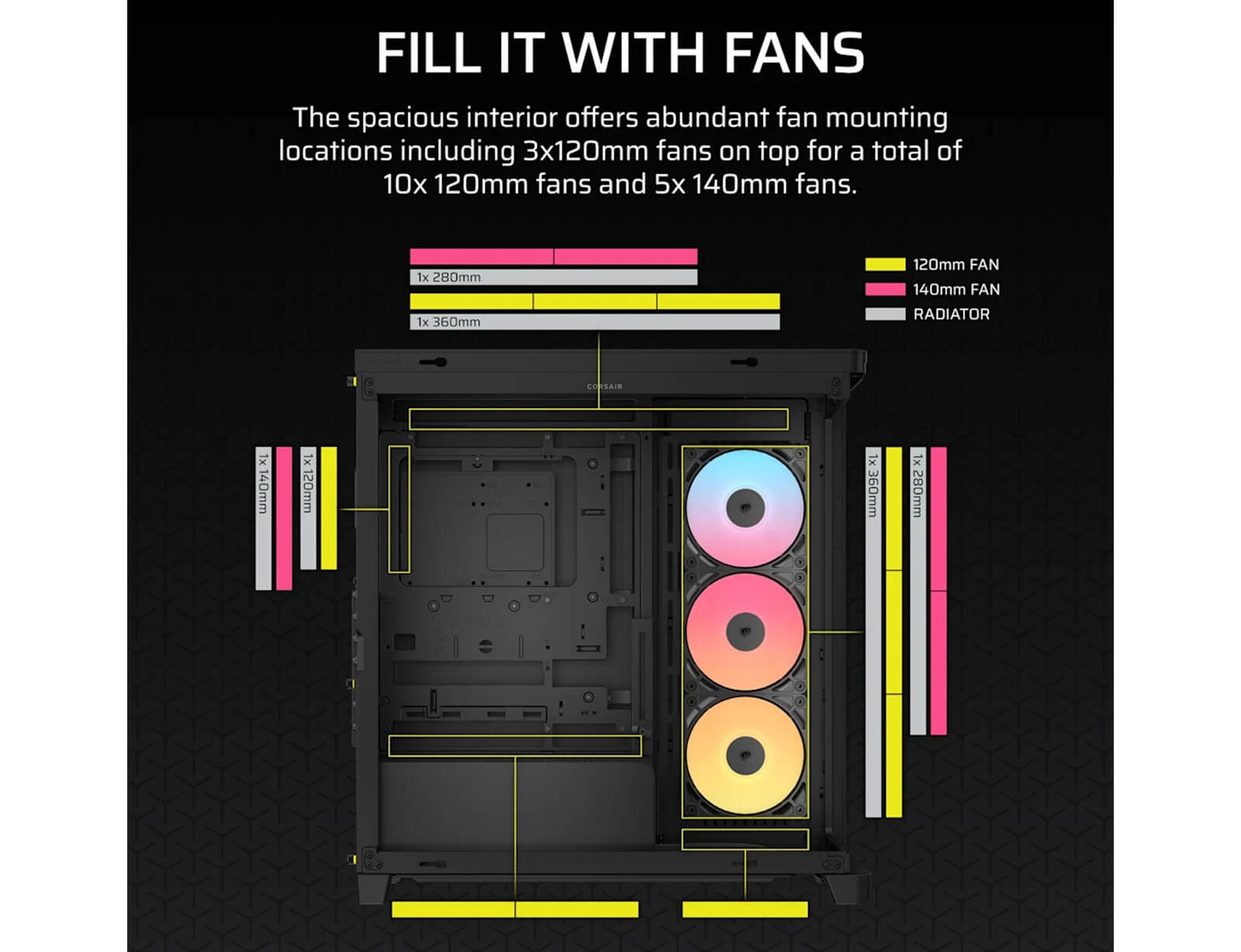 | Συμβατά Συστήματα Ψύξης | Fans- Κορυφή: x3 120mm ή x2 140mm / Κάτω μέρος: x3 120mm ή x1 140mm / Πλάι: x3 120mm ή x2 140mm / Πίσω: x1 120mm ή x1 140mm / Υδρόψυξη έως 360mm |
