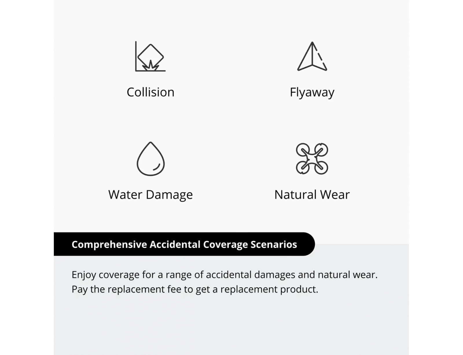Σε περίπτωση ατυχήματος, έχετε τη δυνατότητα αντικατάστασης του κατεστραμμένου προϊόντος με επιπλέον χρέωση αντικατάστασης. Οι συσκευές αντικατάστασης είναι ολοκαίνουργιες ή ισοδύναμες με ολοκαίνουργιες σε απόδοση και αξιοπιστία, διασφαλίζοντας ότι το DJI Mini 5 Pro συνεχίζει να λειτουργεί στο μέγιστο των δυνατοτήτων του.
